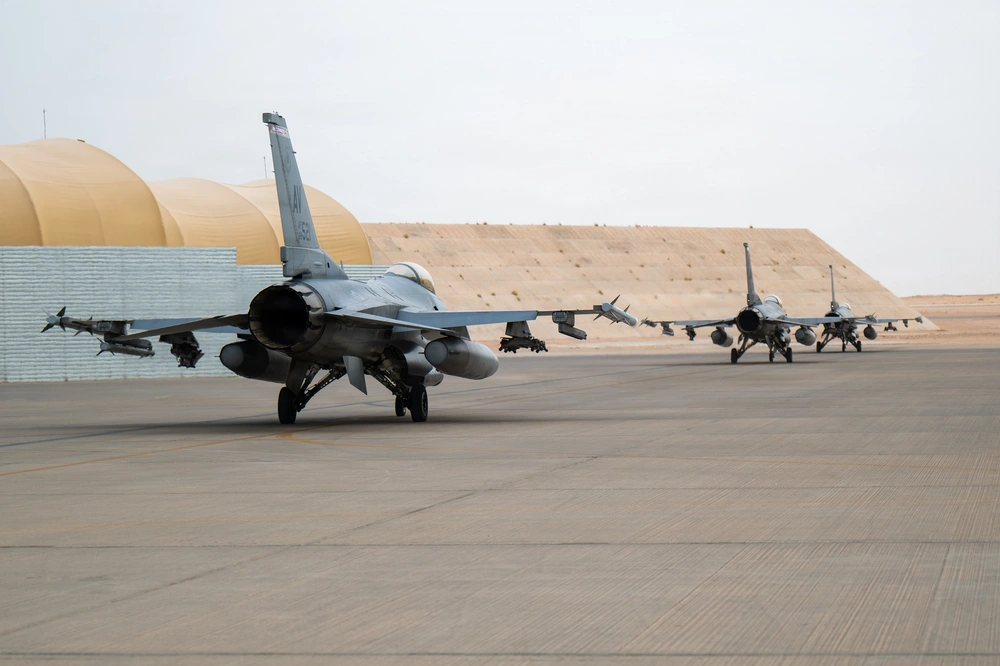 La aeronave F-16 Fighting Falcon del 555º Escuadrón Expedicionario de Cazas de la Fuerza Aérea de los Estados Unidos rueda por la pista durante el ejercicio Blue Sands 26.1 en el área de responsabilidad del Comando Central de los EE. UU., el 11 de diciembre de 2025. (Foto de la Fuerza Aérea de los EE. UU. por el Aviador Senior De’Quan Simmons)