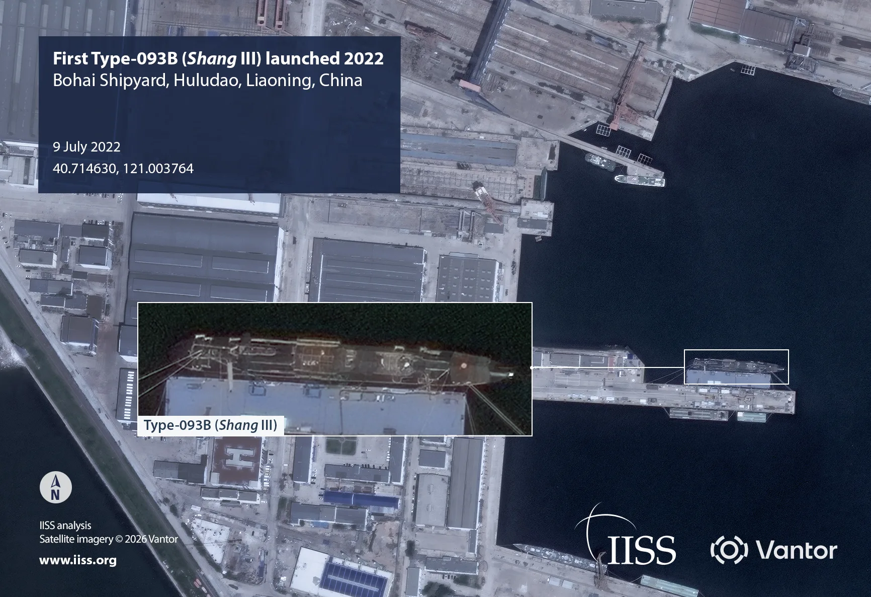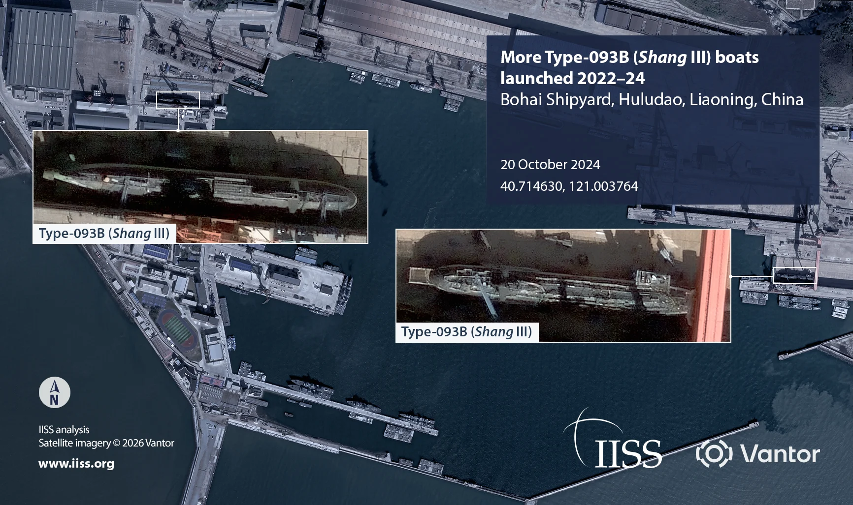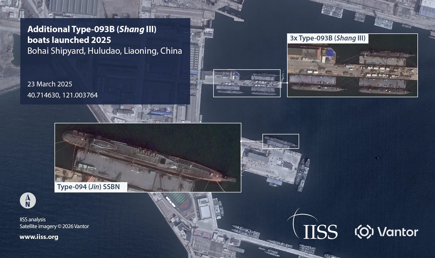 Entre las unidades más relevantes figuran el séptimo y octavo submarino balístico nuclear Tipo 094 (clase Jin), pilares de la tríada nuclear de Beijing. Además, China avanzó con el despliegue del Tipo 093B (Shang III), una versión mejorada de submarino nuclear lanzamisiles de crucero equipada, según evaluaciones, con sistemas de lanzamiento vertical (VLS). Las imágenes satelitales comerciales y evaluaciones oficiales estadounidenses sugieren que hasta nueve unidades de esta clase podrían haber sido botadas desde 2022, a un ritmo cercano a dos por año.