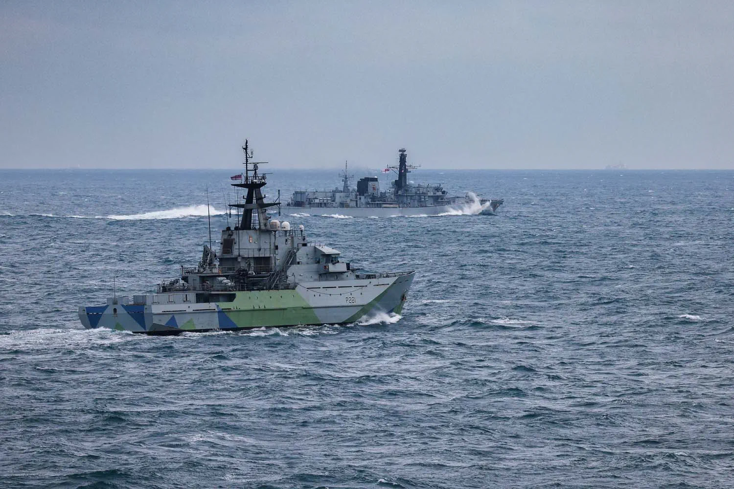 HMS Tyne en primer plano con la fragata HMS Iron Duke siguiendo a los buques rusos en el Canal en febrero. Crédito: Real Armada Británica