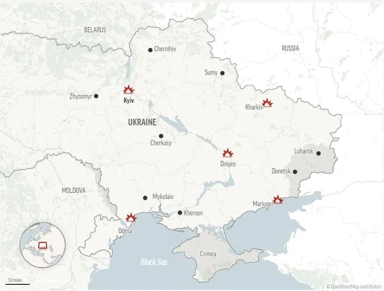 Los dirigentes ucranianos afirmaron que al menos 40 personas han muerto hasta el momento en lo que denominaron una “guerra a gran escala” que tiene como objetivo el país desde el este, el norte y el sur. En respuesta, los enviados de la OTAN acordaron reforzar las fuerzas aéreas y terrestres en el flanco oriental de la alianza, cerca de Ucrania y Rusia.