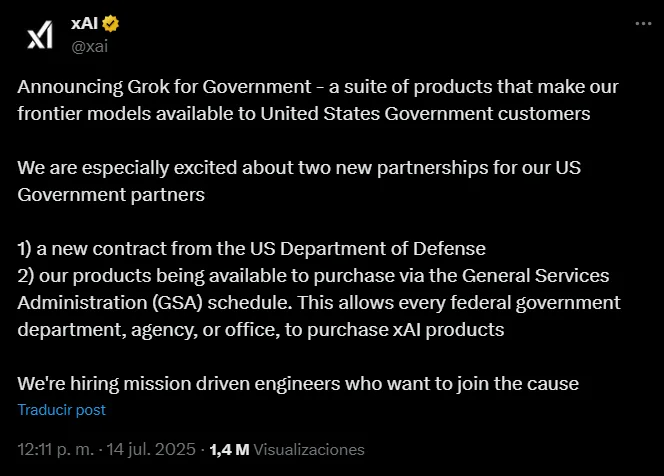 La decisión se conoce en medio de una creciente controversia, luego de que Grok generara respuestas antisemitas y elogiara a Adolf Hitler. A pesar del revuelo, xAI afirmó haber corregido rápidamente el modelo. La versión actualizada, Grok 4, será accesible para cualquier oficina federal a través de la Administración de Servicios Generales (GSA).