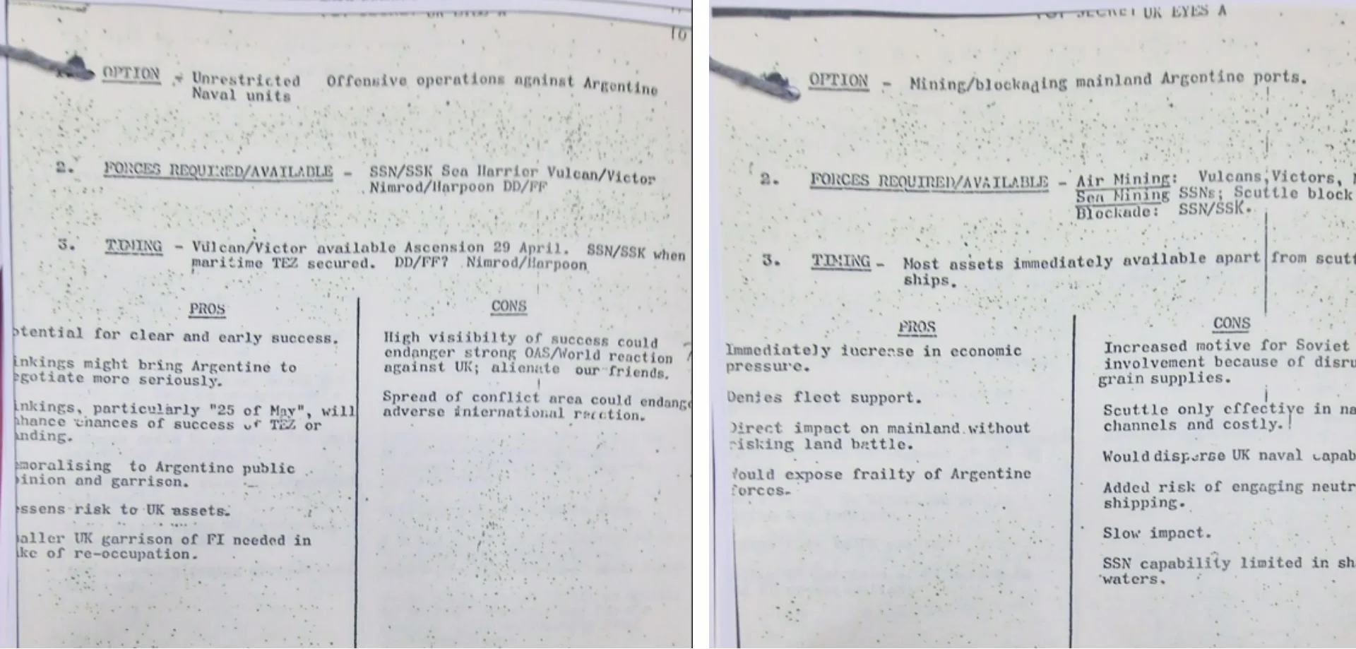 El hilo sugiere que los planes habrían sido elaborados tiempo después de haber iniciado el conflicto, como parte de un documento integral que analizaba ventajas y riesgos de cada maniobra posible. Entre las alternativas discutidas se encontrarían una guerra naval sin restricciones contra la Armada Argentina, un bloqueo total de la costa atlántica argentina mediante minas y submarinos, y una invasión anfibia para forzar una negociación o la rendición total de las fuerzas argentinas.