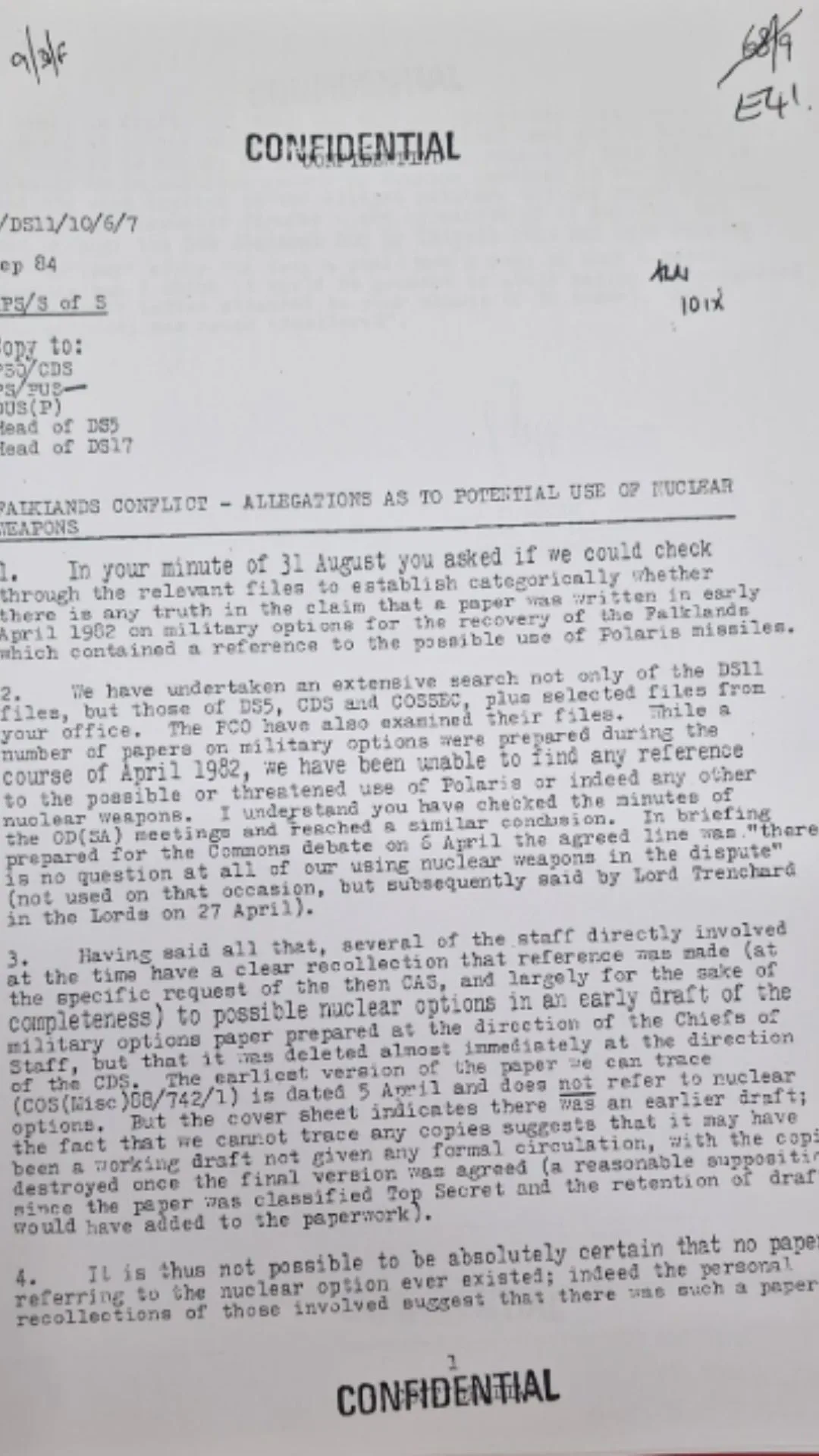 En septiembre de 2025, Escenario Mundial reveló que documentos desclasificados del Ministerio de Defensa británico mostraban que Londres había considerado el eventual uso de armas nucleares tácticas en el Atlántico Sur, “por motivos de completitud” en sus estudios estratégicos de 1982. El informe —desclasificado bajo el Freedom of Information Act— confirmaba que el Reino Unido llegó a desplegar cabezas nucleares a bordo de buques rumbo al Atlántico Sur, aunque oficialmente nunca se contempló su utilización en combate.