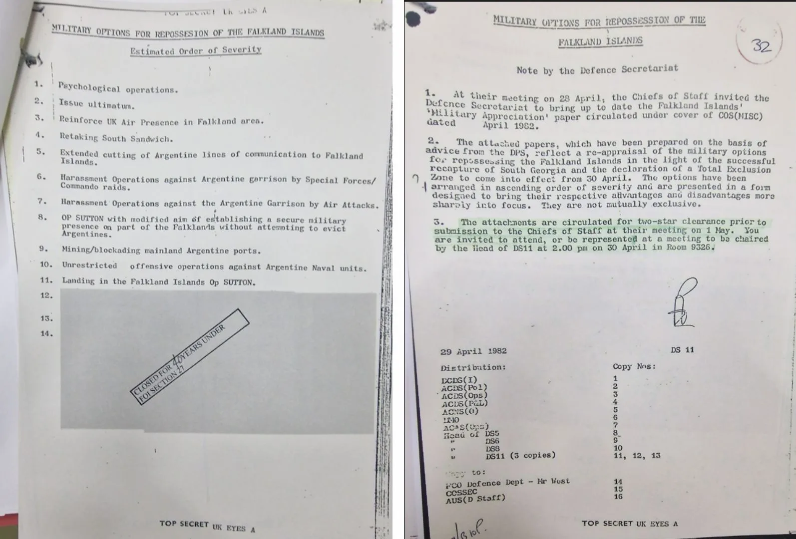 Un reciente informe en redes sociales publicado por el analista británico Sir Humphrey (@pinstripedline) reavivó las especulaciones sobre los planes de guerra confidenciales que el Reino Unido habría evaluado el 29 de abril de 1982, en plena Guerra de Malvinas. Según el autor, ese día los jefes del Estado Mayor británico discutieron 14 posibles opciones militares “en orden ascendente de severidad” para recuperar las islas. De ellas, tres permanecen clasificadas y no podrán ser reveladas hasta el año 2057, bajo la cláusula de “daño a las relaciones internacionales” del Ministerio de Defensa británico (MOD).